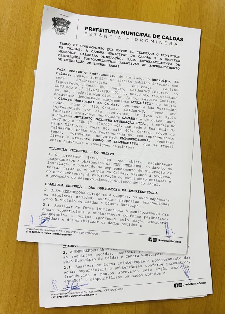 Após anuência concedida pelo CONGEAPA na semana passada, o Município de Caldas e a Câmara Municipal firmaram, no dia 13/10, junto à empresa Meteoric Caldeira Mineração Ltda., um Termo de Compromisso com o objetivo de estabelecer obrigações socioambientais relacionadas ao empreendimento de mineração de terras raras que está em processo de licenciamento para exploração no […]