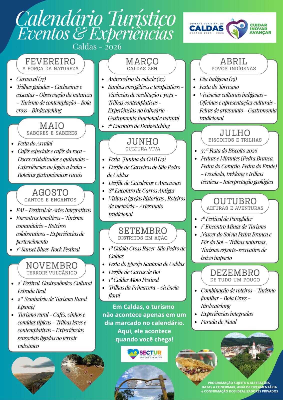 Com o Calendário Turístico 2026, Caldas passa a oferecer previsibilidade ao mercado, estimulando investimentos, fortalecendo empreendimentos locais e qualificando sua presença no cenário regional e estadual. A iniciativa reforça o compromisso do município com um turismo responsável, sustentável e inclusivo, alinhado às tendências do mercado e às demandas contemporâneas do setor.